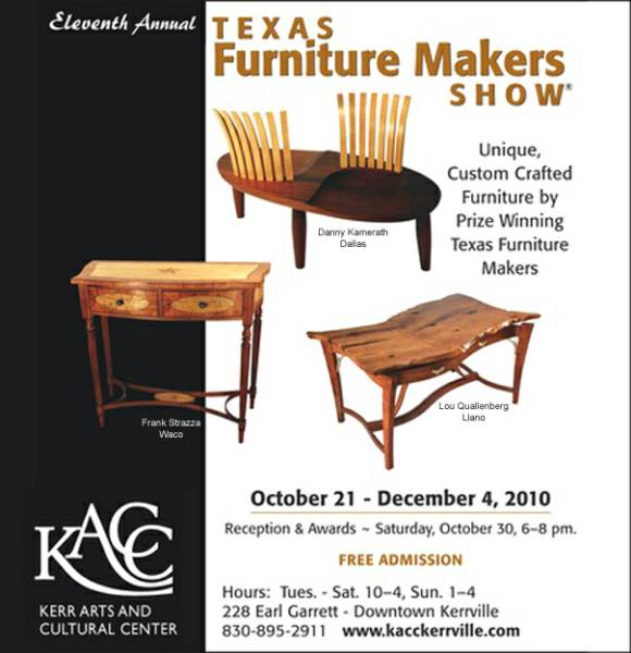 The Texas Furniture Makers Show is a five week long beautiful gallery style show that features some of the top furniture makers in the state of Texas. The Texas Furniture Makers Show is held a the Kerr Arts and Cultural Center in Kerrville, Texas. Most of the Furniture pieces are available for sale. It is a great place to locate a Custom Furniture Artisan from Texas.